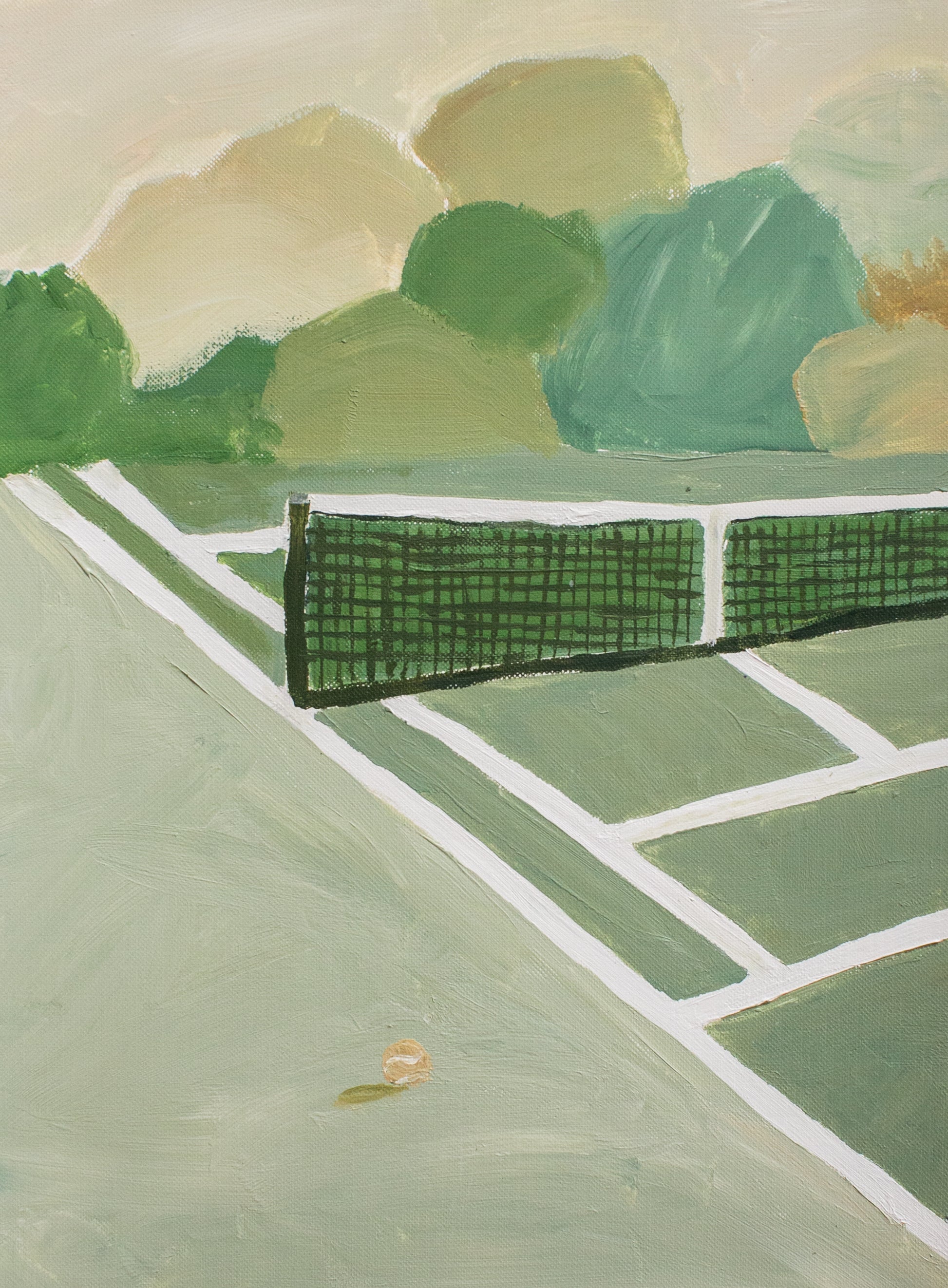 “Courtside” is an expressive abstract piece in soft neutrals of cream, green, and earthy browns. Loose brushstrokes and gestural pencil lines create rhythm and movement, capturing a sense of fleeting energy and calm sophistication.