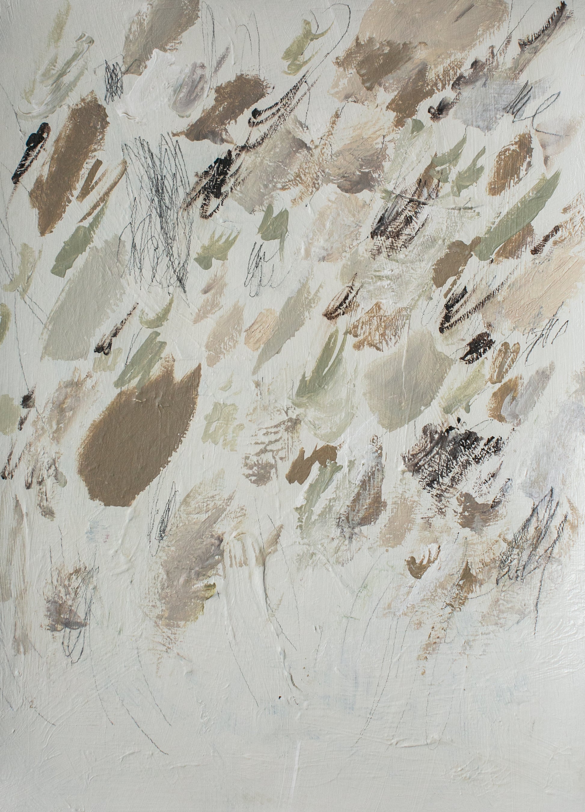 “Darling” is an expressive abstract piece in soft neutrals of cream, green, and earthy browns. Loose brushstrokes and gestural pencil lines create rhythm and movement, capturing a sense of fleeting energy and calm sophistication.