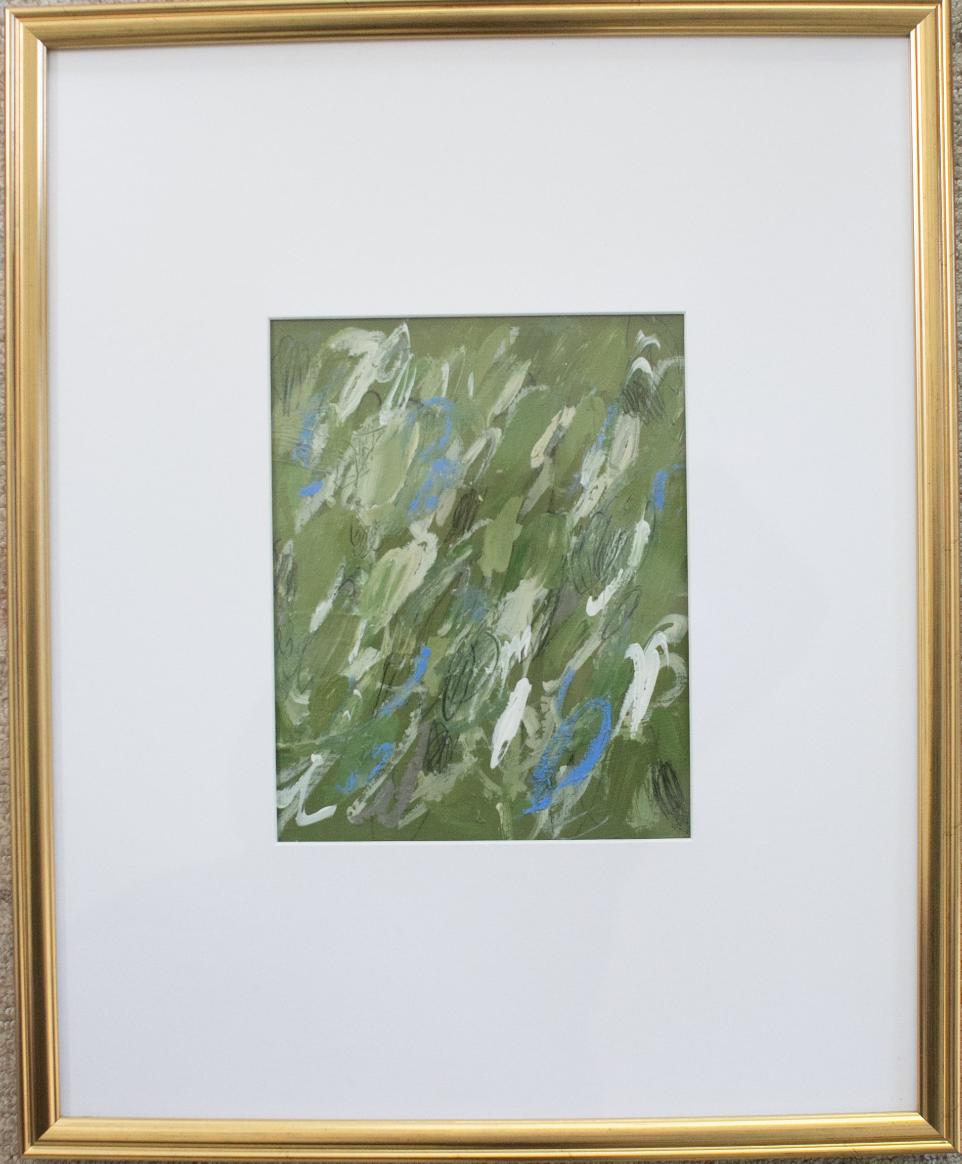 “As Time Passes” is an expressive abstract piece in earthy greens, soft neutrals of cream, sage, and earthy browns. Loose brushstrokes and gestural pencil lines create rhythm and movement, capturing a sense of fleeting energy and calm sophistication.