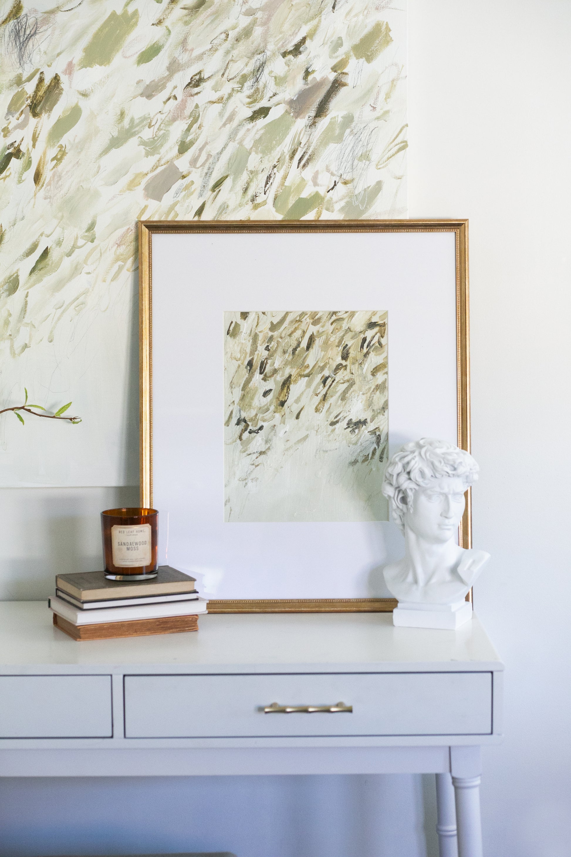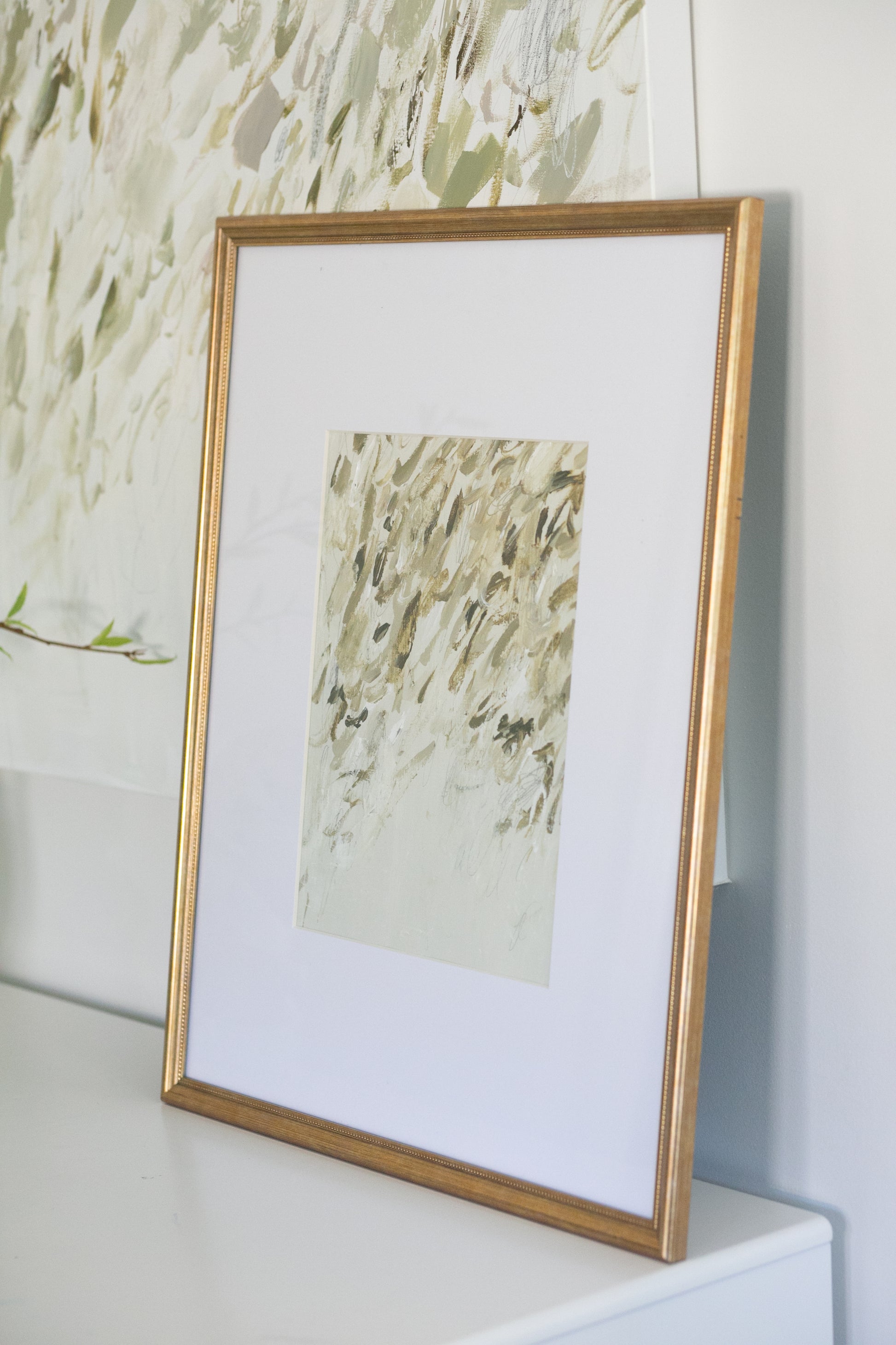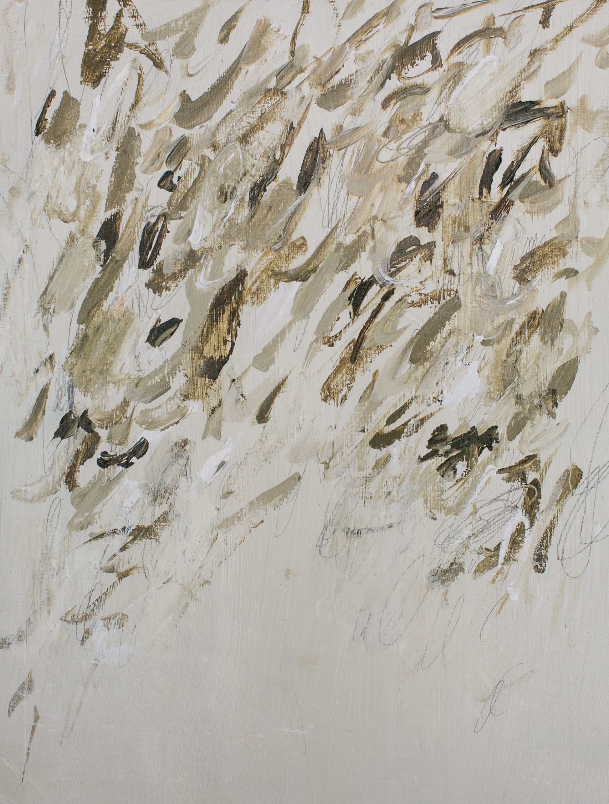 “We Are Lost” is an expressive abstract piece in soft neutrals of cream, sage, and earthy browns. Loose brushstrokes and gestural pencil lines create rhythm and movement, capturing a sense of fleeting energy and calm sophistication.