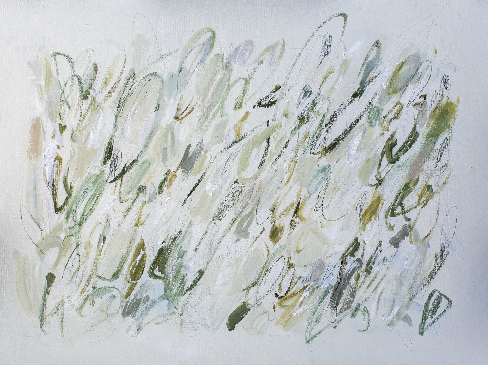 “Thorns” is an abstract exploration of rhythm, memory, and movement. Loops and layered marks in soft blues, greens, and neutrals suggest the passage of time—like fleeting beats, echoes, or moments strung together. The piece balances spontaneity with structure, its textured layers evoking both motion and stillness.